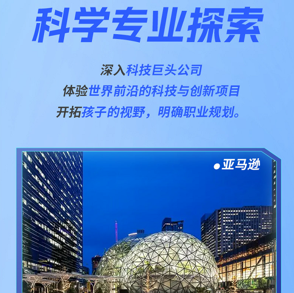 深入科技巨头公司---亚马逊、微软等,体验世界前沿的科技与创新项目,开拓孩子的视野,明确职业规划。